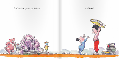 Es cierto que algunas de estas respuestas a ¿para qué sirve un libro? quizás las podríais haber dicho cualquiera de vosotros, grandes amantes de la lectura, pero la originalidad del álbum es cómo se presentan cada una al lector: acompañando a cada respuesta, la autora recrea una divertida escena en una gran ilustración a doble página que relaciona esta respuesta con el título de alguna de las obras maś conocidas de la literatura universal, junto a algunos de los personajes que las protagonizan. Además, al final se hace una fabulosa invitación a los pequeños lectores, porque si cada libro lo ha hecho alguien.... ¡por qué no hacer nosotros nuestro propio libro!