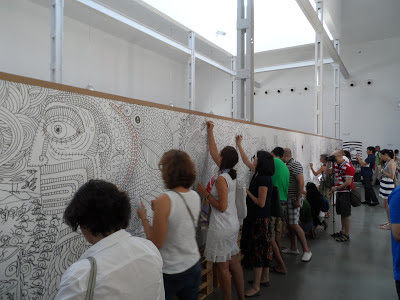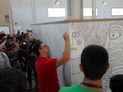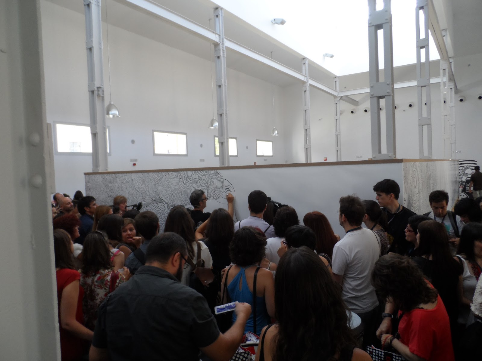 Tras la charla, pasamos a la inaguración de la exposición del ilustrador y diseñador Pep Carrió, basada en su trabajo "Al otro lado de la línea", que nace de los dibujos o garabatos que suelen acompañar a una conversación telefónica. En la Sala Expolava del LAVA, Pep nos invitó a coger un rotulador y continuar libremente los trazos que él mismo había dejado inacabados, retándonos así a abandonar nuestra actitud pasiva como espectadores para pasar a formar parte activa de la obra, interviniendo en ella y a portando nuestras propias ensoñaciones.