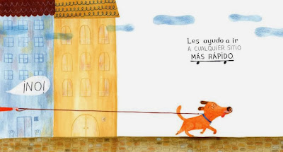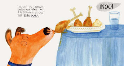 Y es entoces cuando llega la segunda lectura, la verdadera realidad de la historia, que se cuenta a través de la imágenes. Nuestro noble perro es muy bien intencionado, está convencido de que hace lo que debe para que sus dueños lo quieran y estén contentos, pero las ilustraciones nos demuestran lo contrario y ahí es cuando el lector descifrará el misterio del extraño nombre de nuestro amigo ¡No!.
